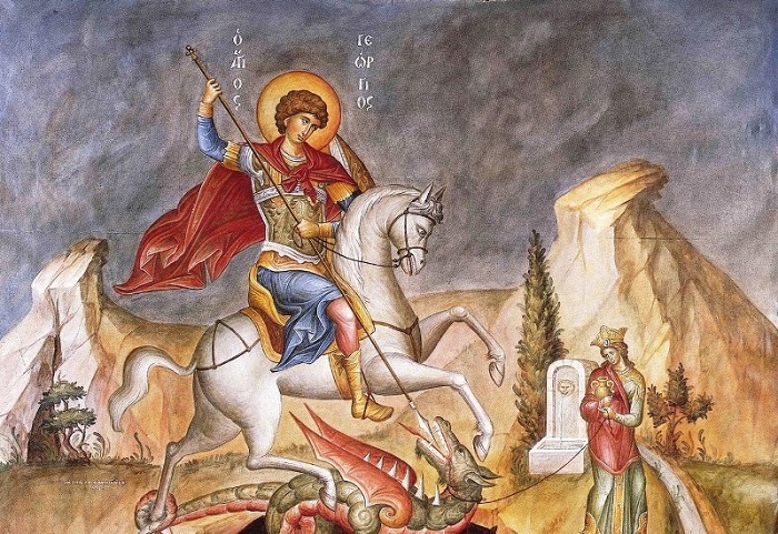 Св. Георги е роден в Кападокия, Мала Азия. Светецът ревностно проповядвал християнската вяра и затова бил затворен в тъмница и посечен през 305 г. Близо до гроба му се заселил змей, който опустошавал околността и владеел водите. Всеки ден змеят искал човешка жертва, за да пуска водите на хората. Когато дошъл ред на царската дъщеря, св. Георги се появил на бял кон и убил змея с копието си и така я спасил. На иконите е изобразен въоръжен с копие и яхнал бял кон, а прободеният змей лежи в краката му.